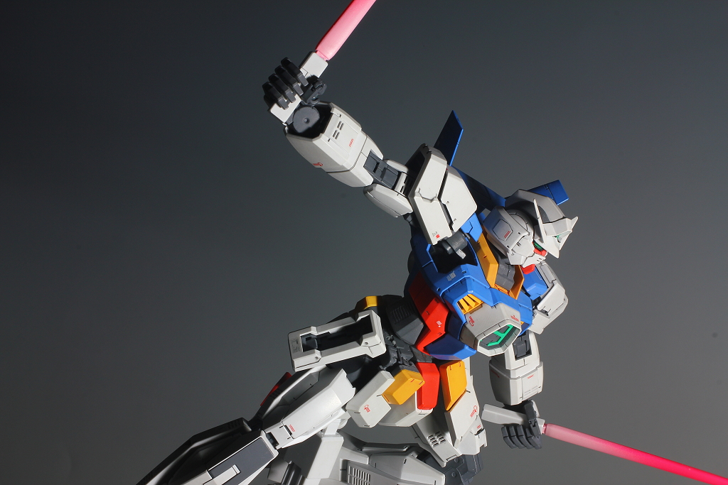 這是當初在製作時所設想,MG AGE-1的DEMO要以菲利特篇與阿瑟姆篇做區隔,菲利特運用AGE-1的方式與阿瑟姆略有不同,菲利特大多數都是以槍+盾的模式,而阿瑟姆習慣用雙刀流,我一開始雖然找了很多動畫的片段來調校姿勢,不過做到一半才發現,很多動作仍然不是MG可以做的出來的,坦白說,最終的成品,與原先的預想有不小的落差~XD